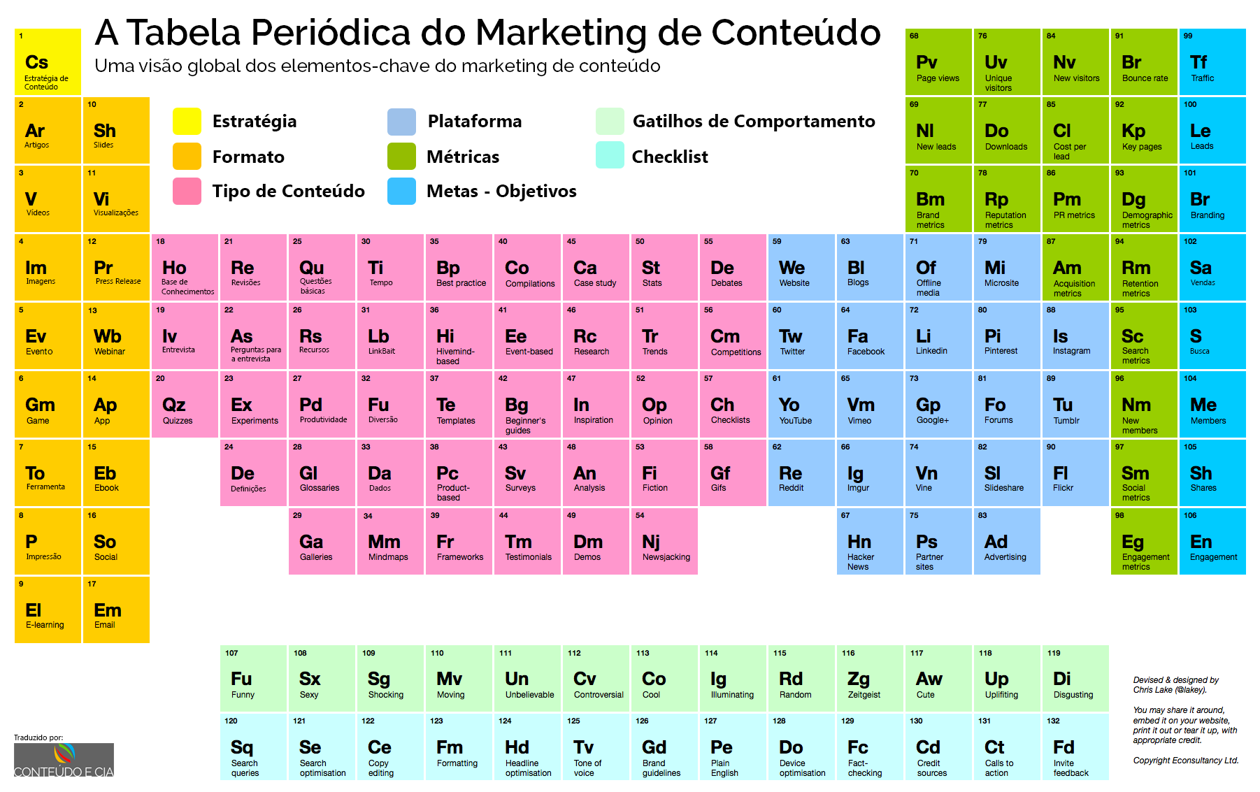 Os elementos da Tabela Periódica do Marketing de Conteúdo, segundo Chris lake, com comentários meus. 🙂