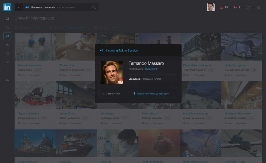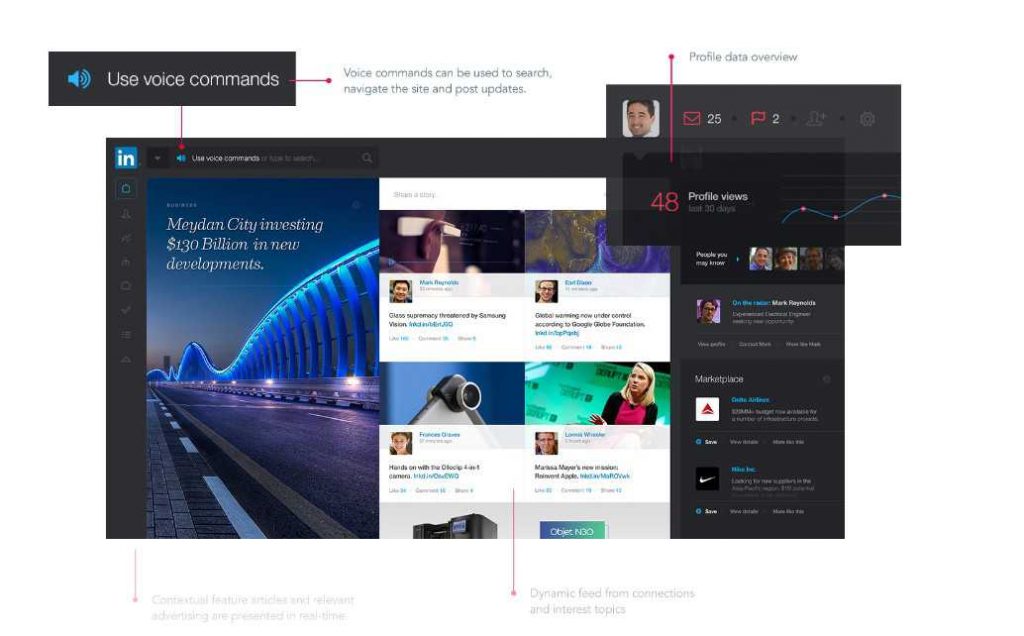Além de muito bonito, todo o conceito do novo Design criado para o LinkedIn explora de forma bastante inteligente os recursos existentes da rede e mais alguns outros que ele sugere que seja aplicado no futuro, como busca por comando de voz.