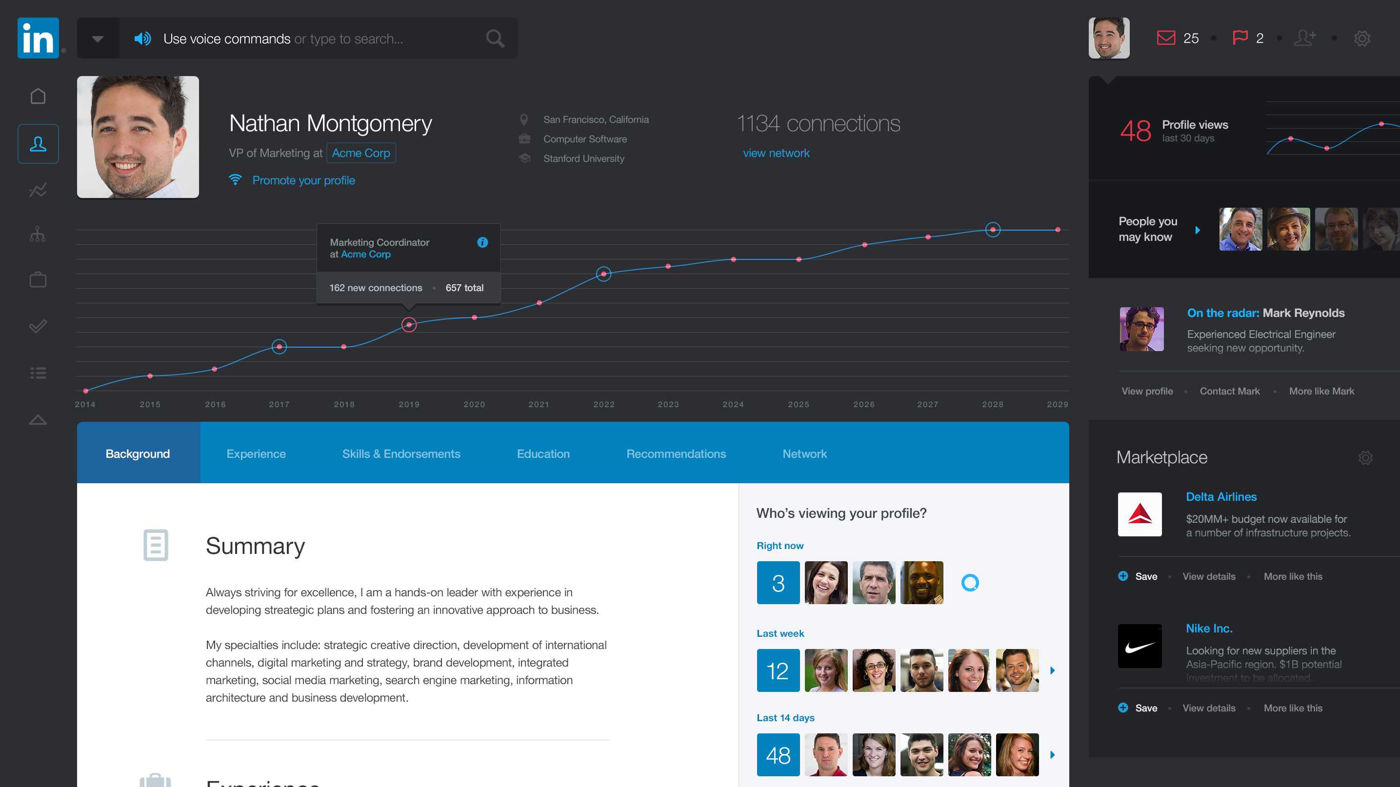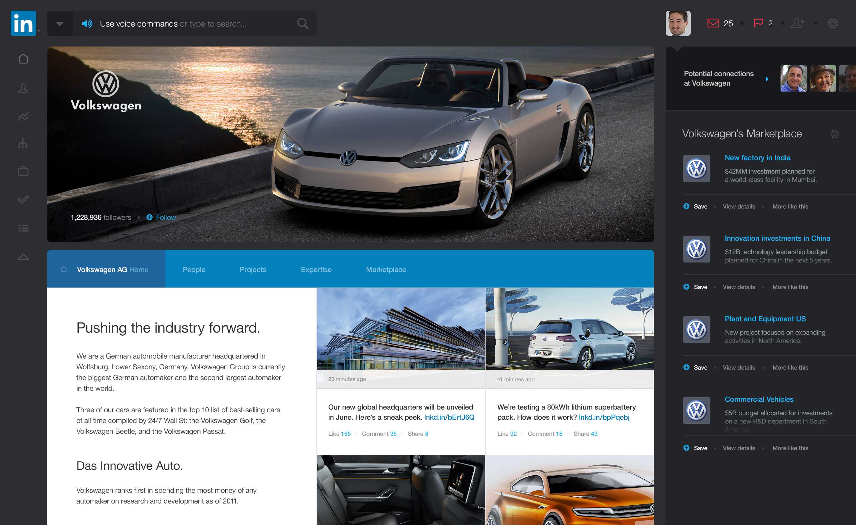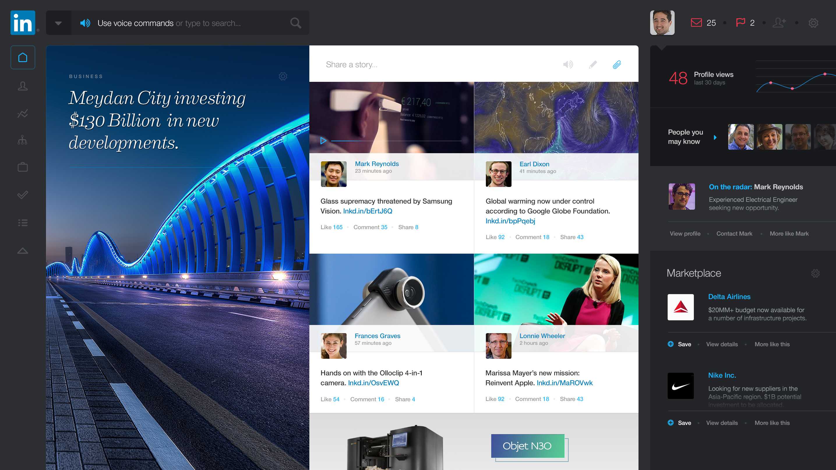 Além de muito bonito, todo o conceito do novo Design criado para o LinkedIn explora de forma bastante inteligente os recursos existentes da rede e mais alguns outros que ele sugere que seja aplicado no futuro, como busca por comando de voz.