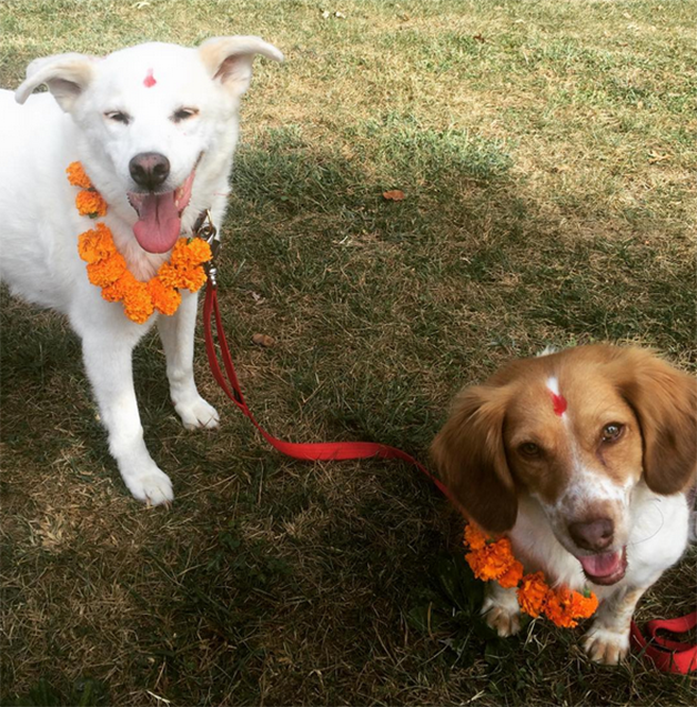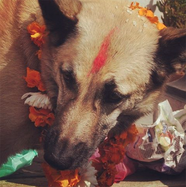 Para os Hindus, os cães são considerados mensageiros do Deus da Morte, Yamaraj. Durante o festival os cães são marcado com um pó vermelho, como sinal de respeito a santidade, flores e, claro: comida!